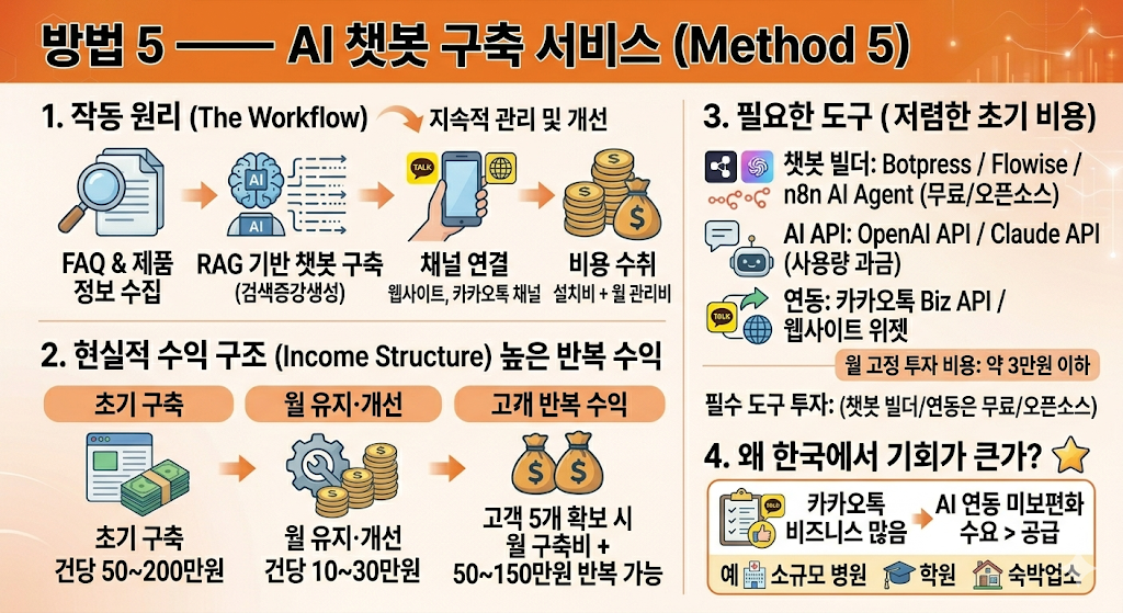 | AI 챗봇 구축 | 월 2만원 | 높음 | 1~2개월 | 100~400만원 | 반복 구독 |